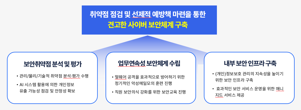 취약점 진단 과정에서 전문가들이 외부/내부자 관점으로 진단 대상의 범위 및 환경을 파악하고 맞춤형 체크리스트 기반의 진단과 분석을 통해 기업은 보안 취약점을 제거할 수 있으며 이행 조치 지원을 통해 보안 수준을 향상시킬 수 있습니다.
